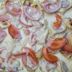 Заливаем подготовленным соусом так, чтобы все рожки были полностью покрыты соусом.