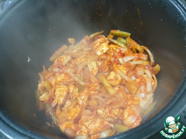 Азу из курицы - Рецепт для приготовления в мультиварке. Комплексные блюда такие как жаркое, рагу и азу всегда были востребованы. Ведь им не надо никаких гарниров и прочих дополнительных продуктов. А тут еще и низкая калорийность. Почти со всех сторон блюдо очень хорошее, разве что гликемический индекс немного хромает (картофель) — но ведь иногда можно сделать и исключение. Гликемический индекс — Низкий, Калорийность — 94 ккал/100гр (Сверх Низкая) Данный рецепт можете использовать в любой мультиварке (я использовал мультиварку Redmond RMC-M40S 700W)