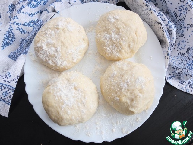 Тесто делим на четыре части, выкладываем на тарелку подпыленную мукой, накрываем пищевой пленкой и убираем в холодильник на 20-30 минут. -