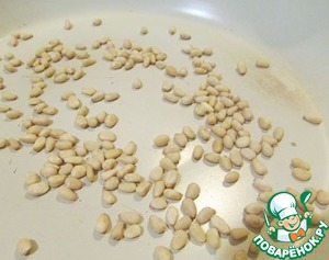 Кедровые орехи прокалить на горячей сковородке и оставить остывать.