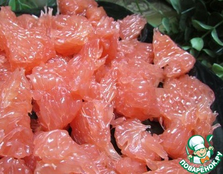 Грейпфрут очистить от кожуры и пленок. Нарвать кусочками, по желанию можно оставить целыми дольками.