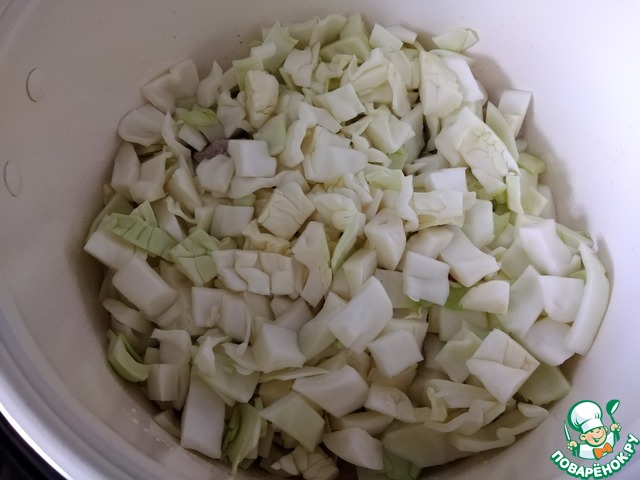 Теперь выкладываем капусту. Капусту очень мелко не шинкуйте. Всё перемешиваем и ещё обжариваем немного.