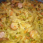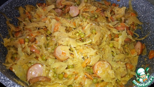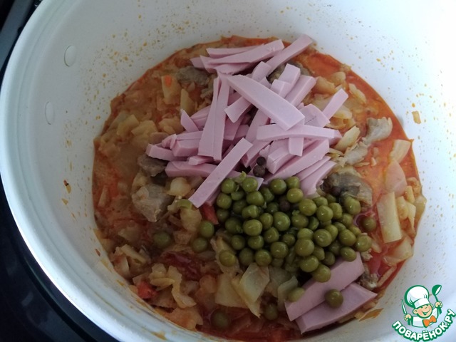 Минут за 15 до окончания, выкладываем порезанную колбасу, зелёный горошек и перец душистый горошком. Солим по вкусу, перемешиваем и продолжаем тушить под закрытой крышкой.