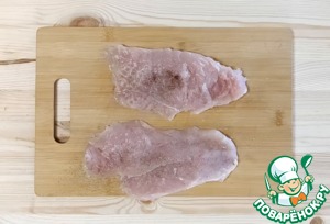 • Куриное филе разрезать на 2 части. Затем с двух сторон отбить, посолить и поперчить.