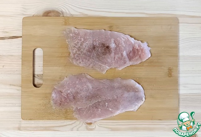Куриное филе разрезать на 2 части. Затем с двух сторон отбить, посолить и поперчить.