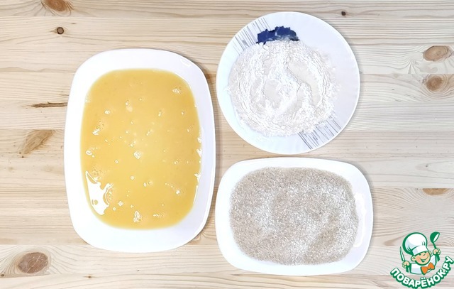 Каждую половинку филе обвалакиваем в муке, затем яйце и панировочных сухарях.