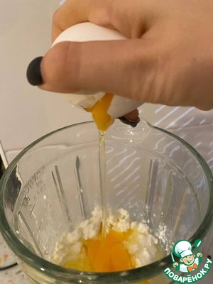 • В сырную массу добавляем яйца, разрыхлитель, щепотку соли, сахар и крахмал.