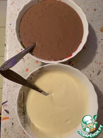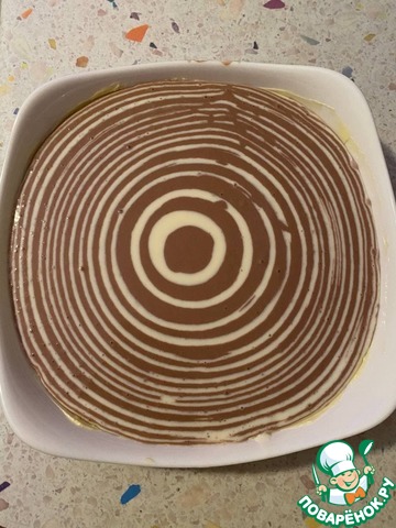 На этот вопрос уже был ответ, вот: Берете ложку белого теста и выливаете по центру формы, потом ложку темного выливаете в центр сверху белого, тесто растекается . И так все тесто чередуя выливать одно на другое в центр сверху