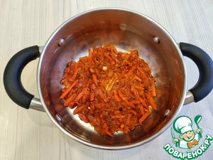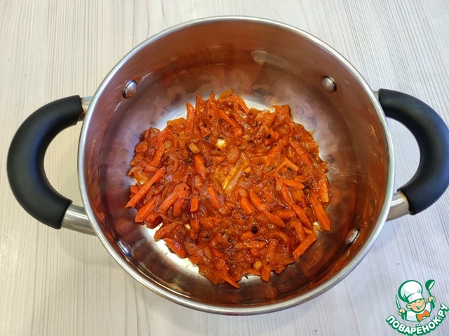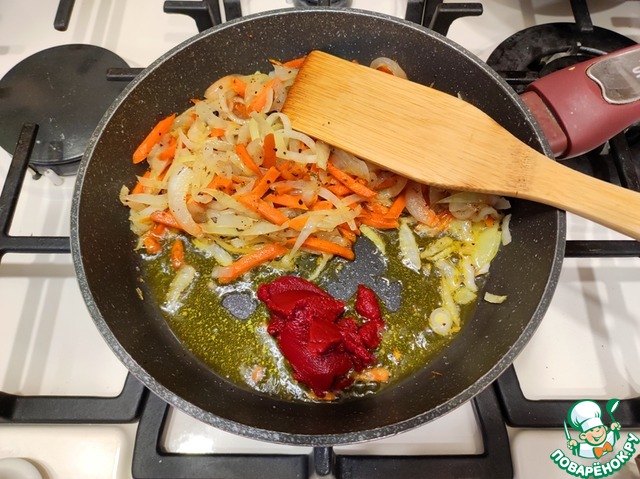 • Пассеровать овощи до мягкости. Затем овощи отодвинуть на край сковороды, добавить 1 ст. ложку, с горочкой, томатной пасты и обжарить пасту в течение нескольких минут.