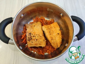 • Обжарить рыбу до золотистого цвета и полуготовности, до готовности мы будем ее доводить в сотейнике с овощами.