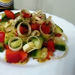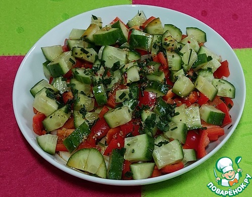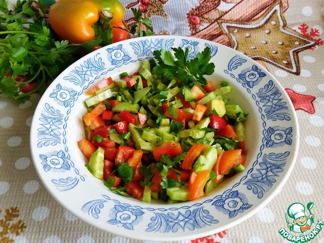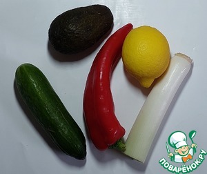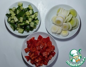 Лук-порей нарезать тонкими колечками, огурец и перец кубиками.
