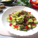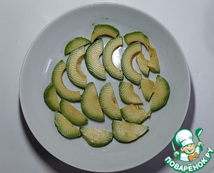 Авокадо нарезать дольками, уложить в глубокое блюдо, слегка сбрызнуть лимонным соком.