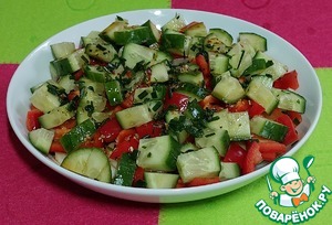 Салат полить заправкой, можно посыпать зеленью, у меня только немного шнит-лук из заморозки.