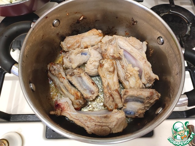 В кастрюлю с толстым дном добавить топленое сливочное масло (2 ст. ложки) и 2 ст. ложки растительного масла. Кастрюлю с маслом хорошо разогреть на среднем огне. Добавить в кастрюлю свиные ребрышки и обжарить до светло- золотистой корочки в течение нескольких минут, на дне может образоваться небольшой пригарочек, это не страшно. Далее добавить небольшое количество воды, с таким расчетом, что бы вода слегка покрывала ребрышки, затем добавить по вкусу соль и черный молотый перец, огонь убавить до минимума и тушить ребрышки до полуготовности около 30 мин.