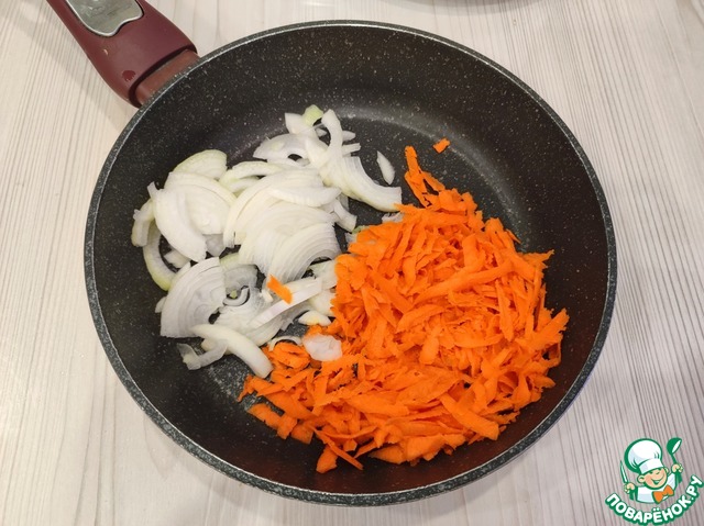 Далее репчатый лук (1 шт.) и морковь (1 шт.) нашинковать соломкой. На сковороду добавить 2 ст. ложки растительного масла, добавить подготовленные к пассеровке овощи. Пассеровать лук и морковь до золотистой корочки.
