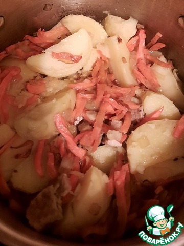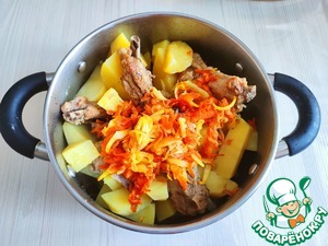 Готовую пассеровку добавить в кастрюлю с тушеными ребрышками и картофелем. Затем аккуратно все перемешать. При таком варианте приготовления блюда лучок и морковь остаются слегка хрустящими, а блюдо наиболее вкусым.