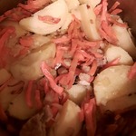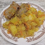 Пока тушатся ребрышки, картофель (700 гр.) нарезать крупными кусочками, затем добавить в кастрюлю, картофель и ребрышки перемешать единожны, при этом посмотреть количество бульона, если его в кастюле будет не много, можно добавить небольшое количество воды, ее в кастрюле должно быть не более 3-4 см. Кастрюлю накрыть крышкой и тушить блюдо на очень-очень!! слабом огне до готовности и мягкости картофеля (перемешивать дополнительно блюдо не нужно). Как только картофель станет мягким, огонь выключить и снять кастрюлю с огня.