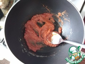 • Теперь добавляем томатный соус типа "Краснодарский". Если нет такового, то кладём томатную пасту. Вновь всё быстро растираем.