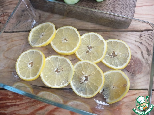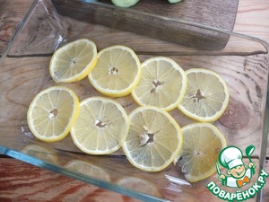 Лимон нарезаем на дольки и выкладываем на дно формы для запекания.