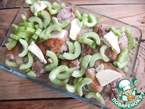 Огурцы я взяла длинноплодные, те, что продаются поштучно. Для моего объема курицы и формы, хватило одного.