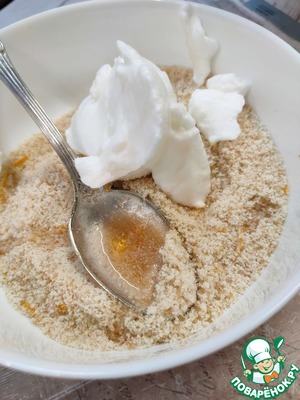 В мучную смесь введите яичный белок, ванильную эссенцию и ликёр.