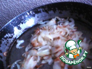 Лук мелко нарезать и обжарить на подсолнечном масле до золотистого цвета.