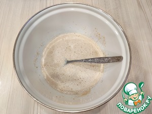 В миску добавить 200 мл. теплого молока, добавить 1 ст. ложку сахара и 10 г. гранулированных дрожжей. Смесь хорошо размешать. Миску накрыть полотенцем или затянуть пищевой пленкой и поставить в теплое место для роспуска дрожжей. Через некоторое время на поверхности смеси образуется шапочка из мелких пузырьков. Опара готова.