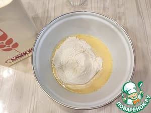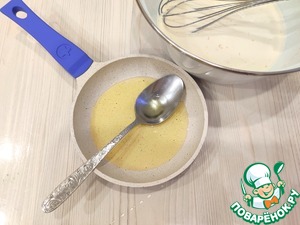 В небольшую емкость добавить 1 ст. ложку топленого сливочного масла, добавить 1 ст. ложку растительного масла. Смесь прогреть на слабом огне. Добавить смесь масел в молочно-яичную смесь. Смесь взбить венчиком.