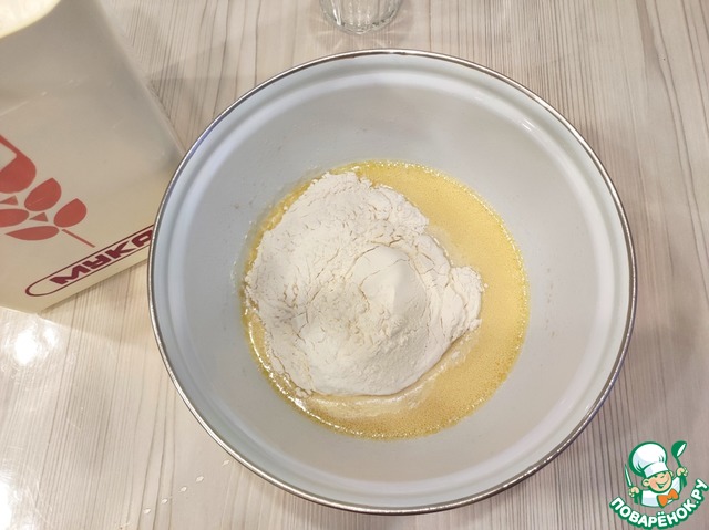Далее добавить общее количество муки (3 стакана). Хочу обратить внимание, муки, возможно, может потребоваться чуть больше или чуть меньше, поэтому муку следует добавлять постепенно. Тесто должно иметь мягкую, не забитую мукой, консистенцию. Емкость с тестом затянуть пищевой пленкой и поставить в теплое место для подъема. Как только тесто достаточно хорошо поднимется, его следует обмять, затянуть миску вновь пищевой пленкой и поставить в прохладное место, можно в холодильник. После второго подъема, а это произойдет примерно минут через 30-40, можно приступить в разделке пирожков.
