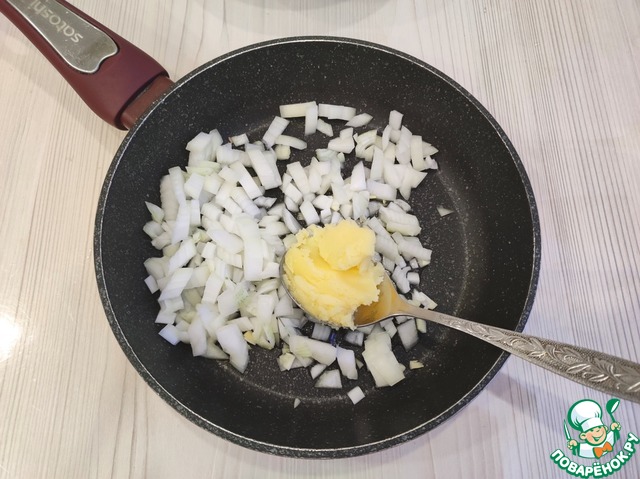 На сковороду добавить 2 ст. ложки топленого сливочного масла. Лук (1 шт.) нашинковать мелкими кубиками.