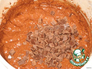 50 г шоколада нарезать на кусочки и добавить в тесто, перемешать, чтобы шоколад равномерно распределился.