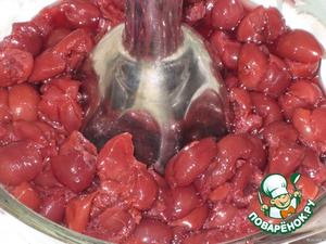 2 стакана вишни (косточки удалить) с помощью блендера превратить в пюре. Вишню можно взять и свежемороженную, тогда немного увеличить количество сахара в тесте, хотя на любителя, сладко будет и так.