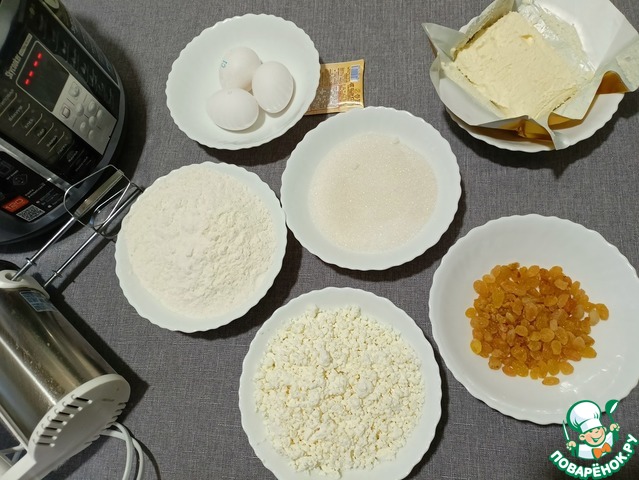 Для комфортной готовки приготовим все продукты. Изюм промыть. Творог можно пропустить через сито.