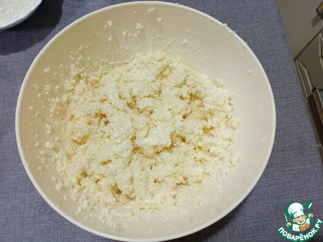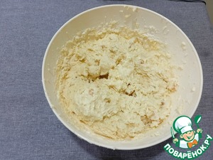 Готовим тесто. Тщательно смешиваем 150 г масла и сахар. Затем добавляем творог — полученную массу доводим до однородной массы.