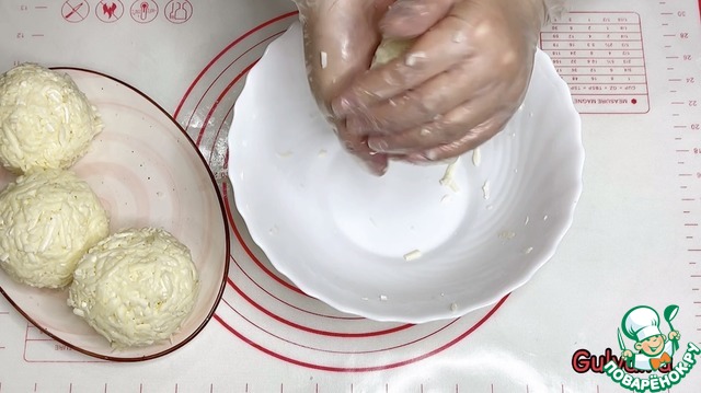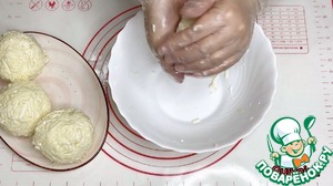 Раскатываем каждое тесто не очень тонко, сверху сырный шар, распределяем равномерно по тесту. Формируем мешочек.
