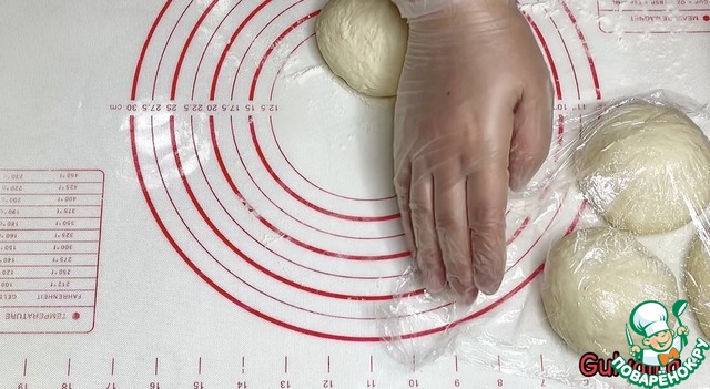 Тесто делим на 4 части. Накрываем пищевой пленкой.