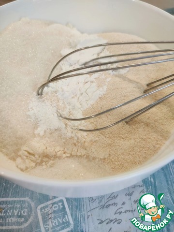 Соедините в миске все сухие ингредиенты: муку, манную крупу, ванильный сахар, соль, разрыхлитель теста. Хорошо всё перемешайте с помощью венчика. Тесто готово.
