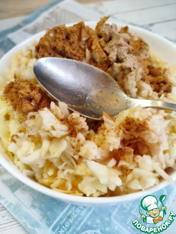 Приготовьте начинку. Яблоки почистите от кожуры и освободите от сердцевины. Натрите на крупной тёрке. Выложите яблоки в ёмкость. Сбрызните соком лимона. Добавьте корицу и мускатный орех. Всё хорошо перемешайте.