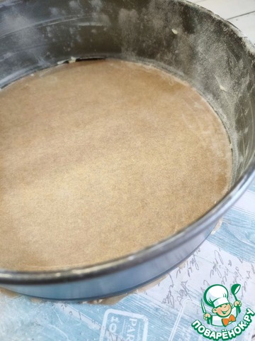 Соберите пирог. Разделите тесто на 4 равные части. Начинку на 3 части. Выложите пирог слоями. Первый слой - тесто, равномерно распределите по дну формы.