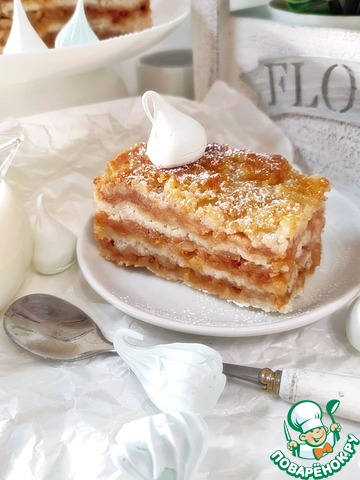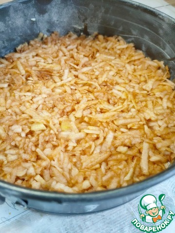 Следующий слой - начинка. Яблоки слегка придавите ложкой. Чередуя слои, соберите пирог, пока не закончится тесто и начинка. Последний слой - тесто.