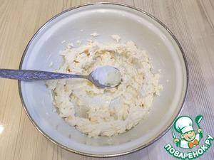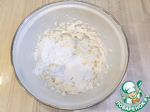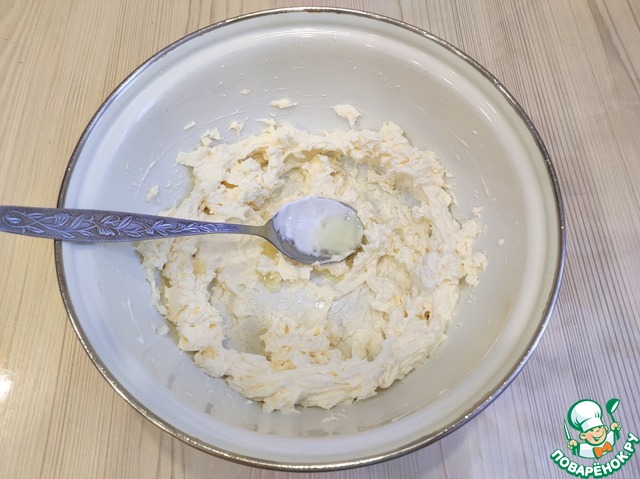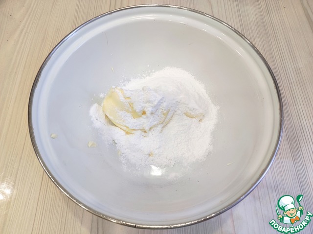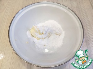 В миску добавить мягкое сливочное масло (120 г.) и сахарную пудру (70 г.) Взбить масло и сахарную пудру до бела.