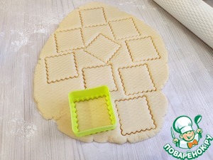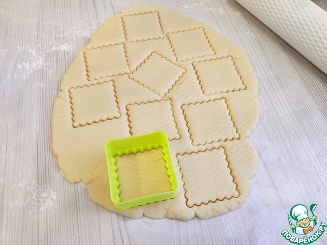 Тесто раскатать в пласт толщиной примерно 0,5-0,7 мм. Выемкой для печенья вырезать различные фигурные изделия.