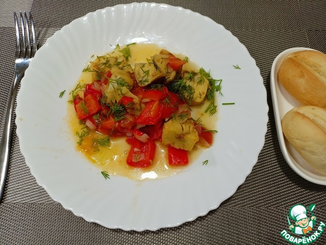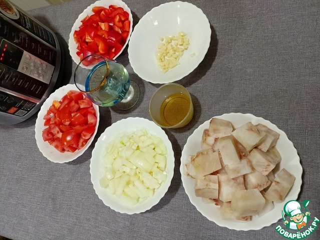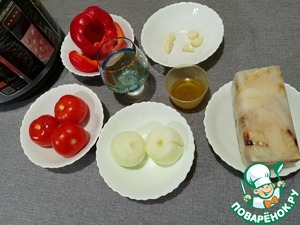 Очень мелко шинкуем чеснок. Средними кусочками перец, лук и помидоры. Ну и минтай — на ваше усмотрение.