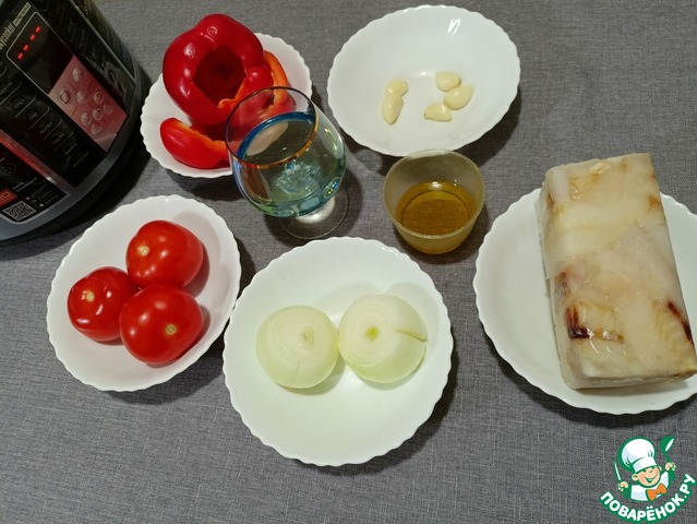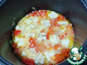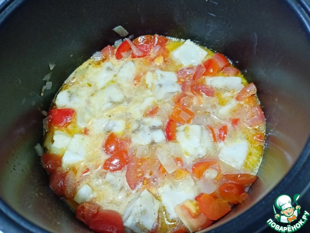 Добавляем в чашу минтай, специи, помидоры и вино — Режим «Тушение» 30 минут (Будет достаточно перемешать один раз в конце готовки). После окончания готовки можно дать еще 10 минут по томиться.
