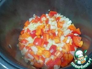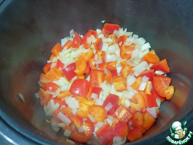 Отправляем в чашу масло, чеснок, перец и лук — Режим «Жарка» 10 минут (Не забываем перемешивать каждые 2-3 минуты)