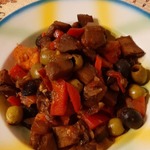 Обжарим минуты две и добавляем оливки и каперсы, вольем две столовые ложки винного уксуса, обжариваем еще минуту.