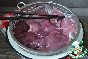 Приготовить продукты, печень вымыть, дать стечь жидкости.