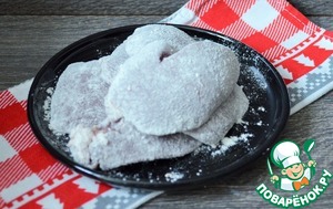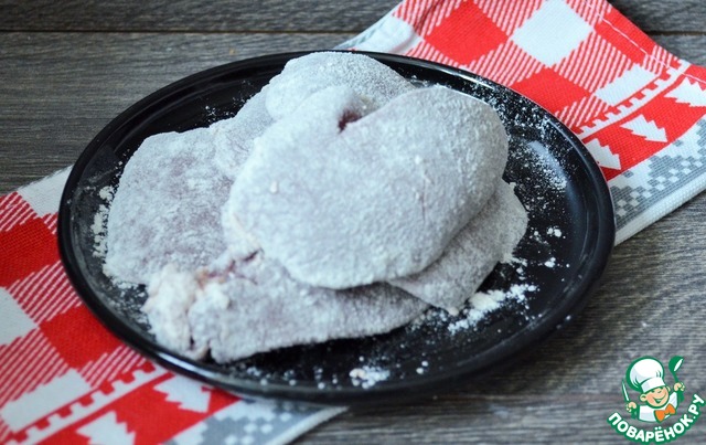 Запанировать кусочки печёнки в муке, затем обмакнуть в яйце.