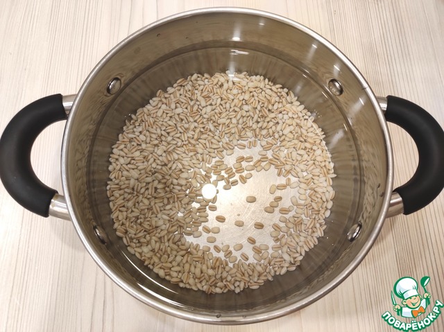 • Перловую крупу (2 ст. ложки) тщательно промыть, далее замочить на ночь в холодной воде. Затем вновь промыть в 2-х - 3-х водах. В кастрюлю добавить холодную воду, добавить в кастрюлю перловую крупу. Кастрюлю поставить на интенсивный огонь, дать закипеть и варить крупу примерно минут 10-15, затем воду слить, добавить вновь 2,5 литра воды и варить перловую крупу до полуготовности.