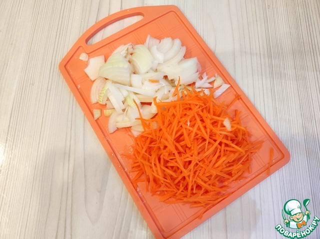 • Репчатый лук (1 шт.) нарезать полукольцами, морковь (1 шт.) нашинковать соломкой.
